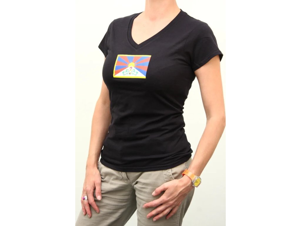 Bavlněné tričko s tibetskou vlajkou s výstřihem ve tvaru V